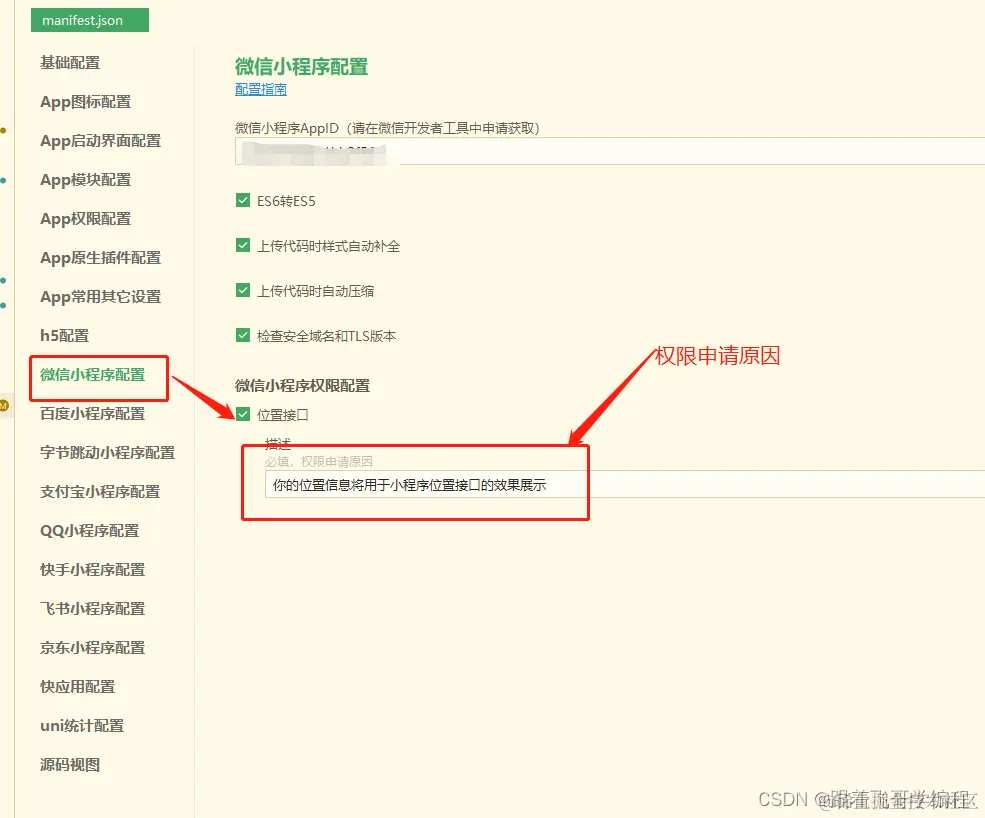 打开manifest.json 勾选位置接口,并添加描叙信息:你的位置信息将用于小程序位置接口的效果展示