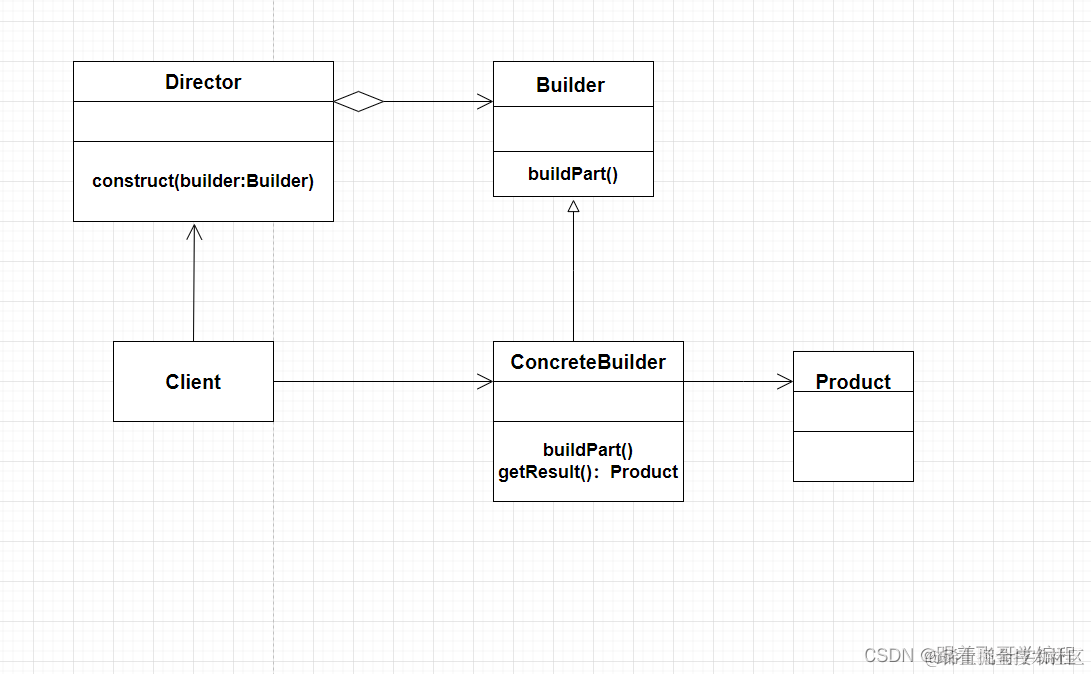 在建造者模式的某些实现方式中可以移除导演类。比如导演类的封装逻辑很简单,这种情况下,可以不需要导演类。简化的类图构建者模式如下图3-1: