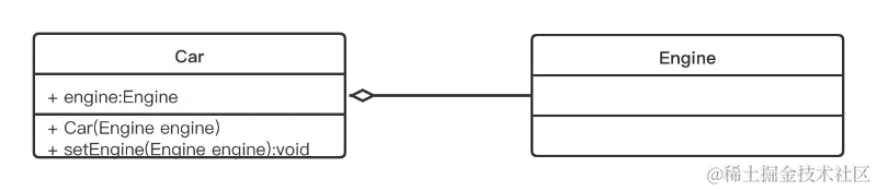 上图中的Car类与Engine类就是聚合关系(Car类中包含一个Engine类型的成员变量)。由上图我们可以看到,UML中聚合关系用带空心菱形和箭头的直线表示。