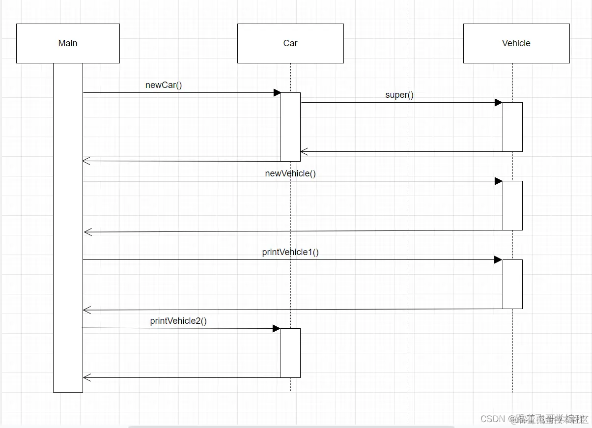 那么这个时候,我们可以使用行为图和交互图,其中顺序图用于描叙类和对象的交互。让我们使用顺序图来显示 Car 对象和 Vehicle 对象如何在继承和多态示例中进行交互,如图 1-2 所示: