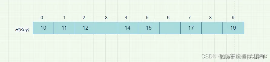 例如:假设散列表的地址范围为 0~9,散列函数为 H(Key) = key%10。输入关键码序列:(14,10,12,17,11,15,19),构造散列表:。