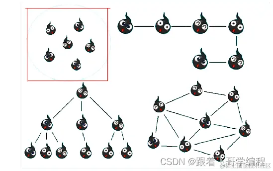 - 有集合、线性结构、树型结构、图型结构。