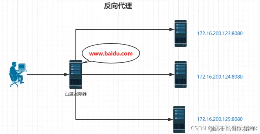 看下面原理图,就一目了然。其实客户端对代理是无感知的,因为客户端不需要任何配置就可以访问,我们只需要将请求发送到反向代理服务器,由反向代理服务器去选择目标服务器获取数据后,在返回给客户端,此时反向代理服务器和目标服务器对外就是一个服务器,暴露的是代理服务器地址,隐藏了真实服务器 IP地址。