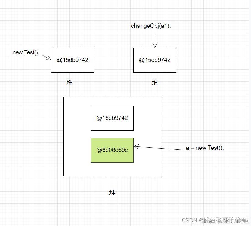 稍微解释下这张图,当我们在main中创建一个Test对象的时候,在堆中开辟一块内存。然后a1持有该内存的地址 @15db9742 (图1)。当尝试调用changeObj方法,并且a1作为实际参数传递给形式参数a的时候,会把这个地址@15db9742 交给a,这时,a也指向了这个地址(图2)。然后在changeObj方法内对参数进行修改的时候,即a=new Test();,会重新开辟一块 @6d06d69c的内存,赋值给a。后面对a的任何修改都不会改变内存@15db974的内容(图3)。