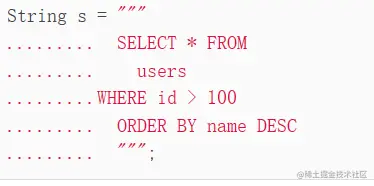 - 显然上述情况使用+可能不太方便,Java13后版本支持使用"""..."""来表示,比如下方的sql语句(感觉怪怪的呢,和python像又不太一样)