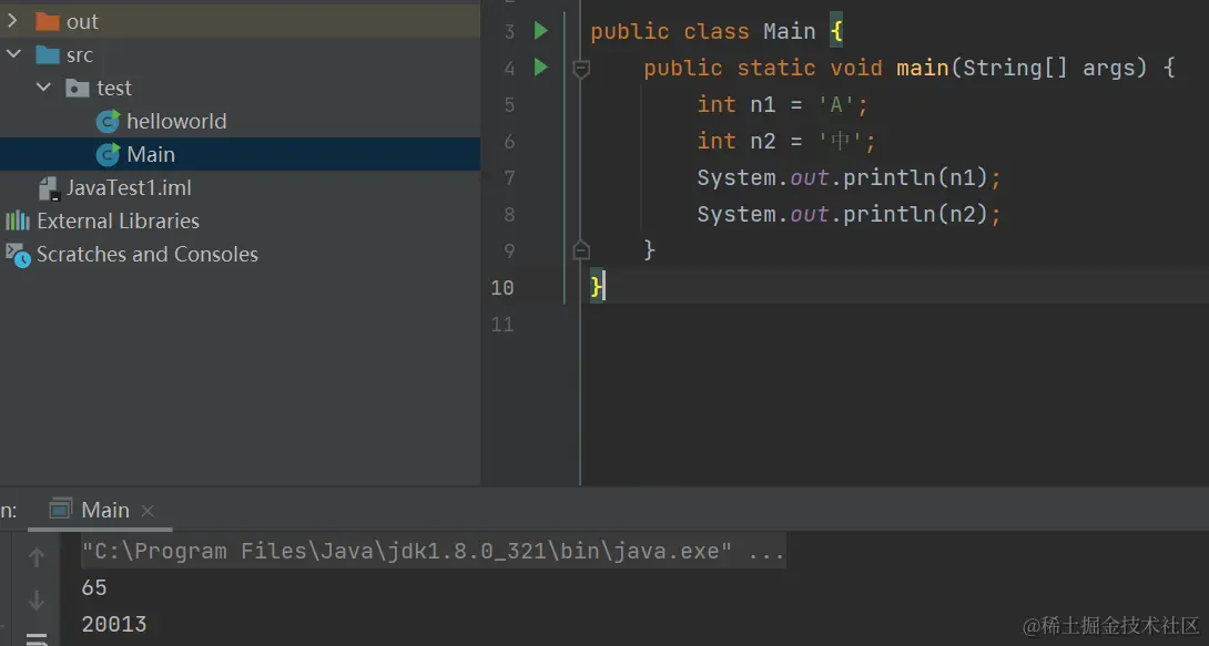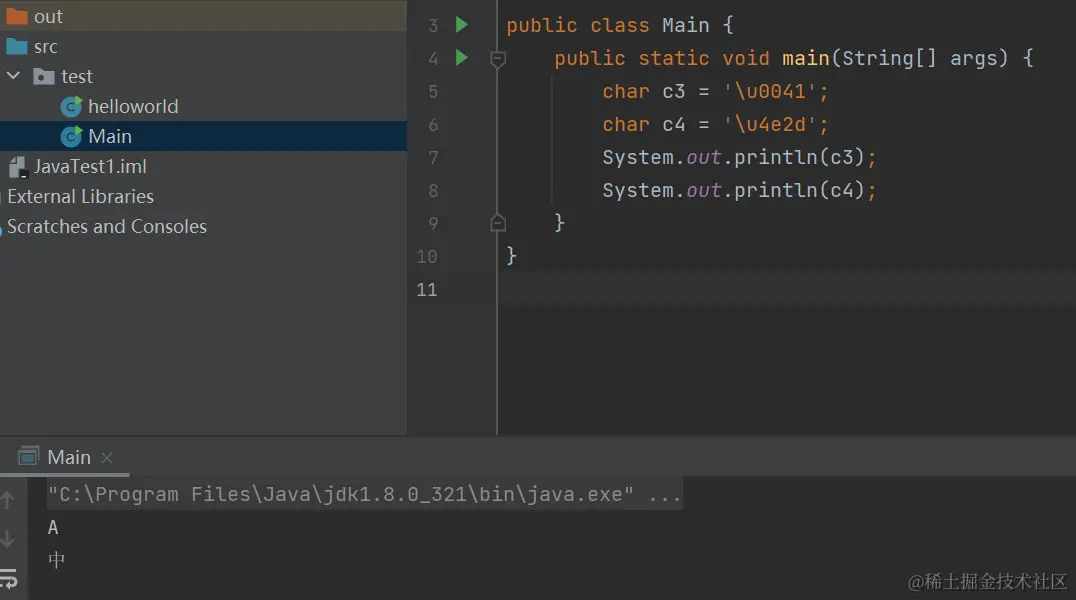 - 一个char保存一个Unicode字符:(个人理解就是下面例子,只能是一个字符,不能表示多个)