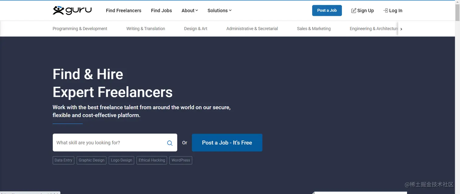 Guru是一个自由工作的在线平台,它拥有数以百万计的优秀网络开发人员、设计师、程序员、和其他自由职业者。这是一个综合性的自由工作平台,也有不少高质的程序员外包工作,适合作为程序员的副业渠道来源。