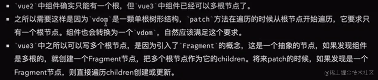 在 Vue3版本中,一个 Vue 实例不再需要一个单一的根元素,而是将多个根元素封装在一个特殊的组件中,这个组件被称为 Fragment。使用 Fragment 可以在一个组件中包含多个根元素,而不需要额外添加不必要的包裹元素。