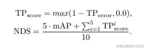 NDS:nuScenes检测分数(NDS)是几个指标的组合:mAP、mATE(平均平移误差)、mASE(平均标度误差)、mAOE(平均方位误差)、mAVE(平均速度误差)和mAAE(平均属性误差)。通过使用上述度量的加权和来计算NDS,mAP的权重为5,其余为1,公式如下: