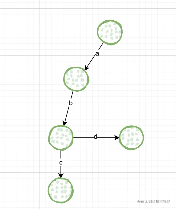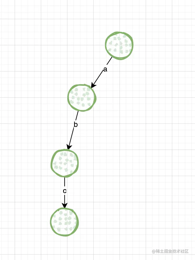 字符串"abc",先准备一个空节点,看这个节点有没有走向“a”的路,如果没有则新建一个节点,需要注意的是,字符不是放在节点上的,字符是放在路上的。然后依次创建走向b和c的路,如下