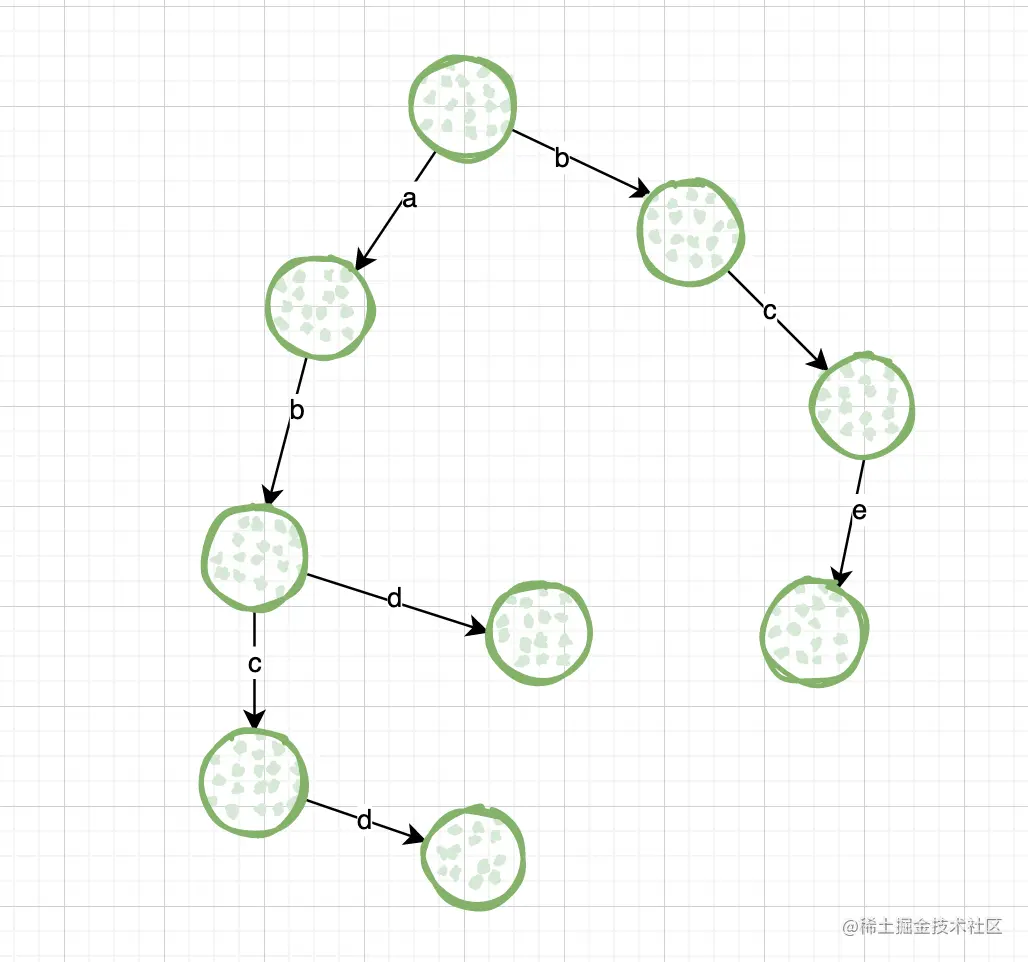 "abd",遍历第二个字符串,因为刚才已经创建了到a和到b的路,所以可以直接拿来复用,而b到d的路没有被创建过,所以只需要创建b到d的路即可,如图