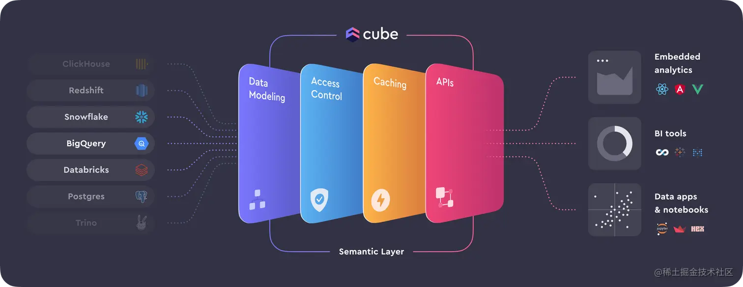 Cube 是用于构建数据应用的语义层。它帮助数据工程师和应用程序开发人员从数据存储中访问数据,将其组织成一致的定义,并将其传递给每个应用程序。