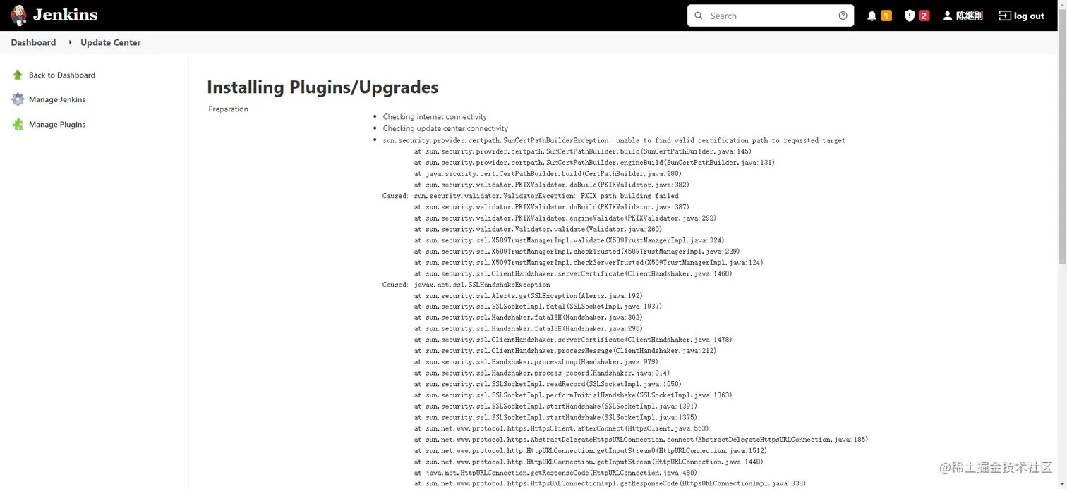 解决方法:找到hudson.model.UpdateCenter.xml文件,将 url 中的 updates.jenkins.io/update-cent… 更改为:mirrors.tuna.tsinghua.edu.cn/jenkins/upd…