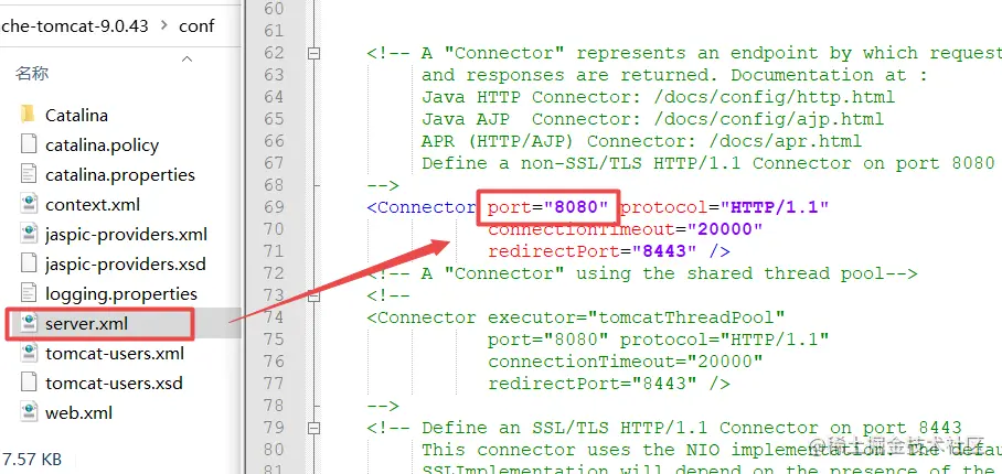 在默认情况下,tomcat的端口是8080,如何需要修改tomcat端口号可以到Tomcat安装目录(或者解压目录)下找到conf文件夹,找到server.xml的文件,将8080端口修改为指定端口即可,8443为HTTPS端口