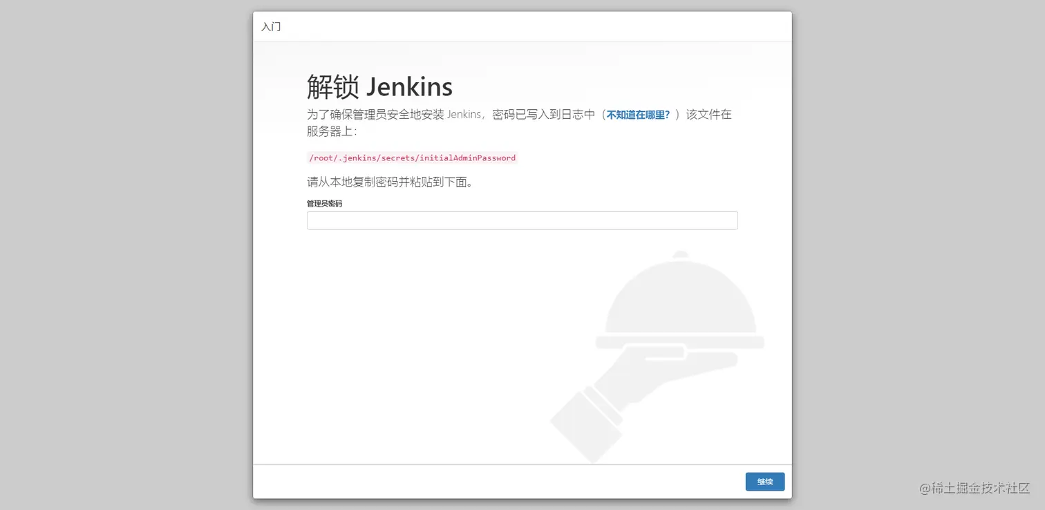 首次访问,需要输入密钥,路径为:/root/.jenkins/secrets/initialAdminPassword