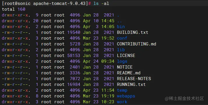 我这里用的是apache-tomcat-9.0.43版本,解压后会得到如下目录文件:
