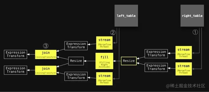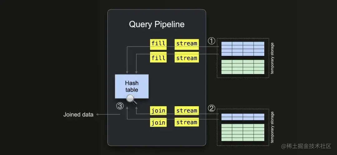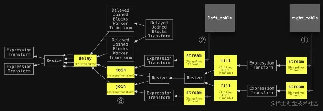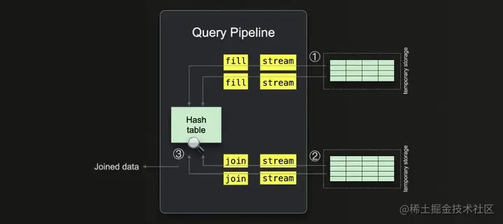 我们可以看到查询流水线 ① 开始于两个并行的流式处理阶段(因为 max_threads 设置为 2),用于从右侧表中流式处理数据,然后是一个单一的填充阶段,用于填充哈希表。另外,还使用了两个并行的流式处理阶段 ② 和两个并行的连接阶段 ③,用于从左侧表中流式处理和连接数据。