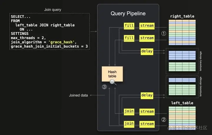 我们可以看到,在步骤①中使用了两个并行流程阶段(max_threads=2),将右表的数据流式传输到内存中。我们还看到使用了两个并行填充阶段来填充内存中的哈希表。在步骤②中,使用了两个并行流程阶段和两个并行连接阶段来流式传输和连接左侧表的数据。延迟阶段表示一些连接阶段被延迟了。