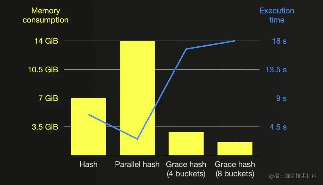 正如之前提到的,每个哈希表的大小最初根据连接键列的类型和某个内部哈希表缓冲区大小的倍数选择并动态增加。哈希表很可能没有完全填充,但是memory_usage指标计算的是为哈希表保留的总内存。