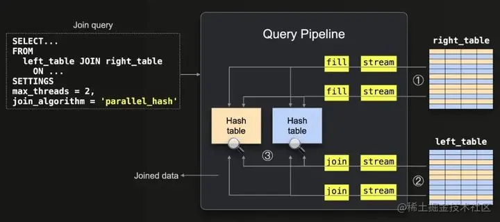 ② 数据从左侧表格流式传输(通过2个线程并行处理,因为max_threads = 2),并且通过在哈希表中查找进行了③ 连接。