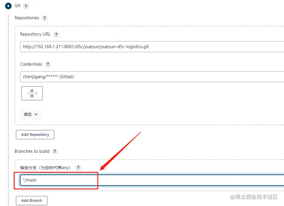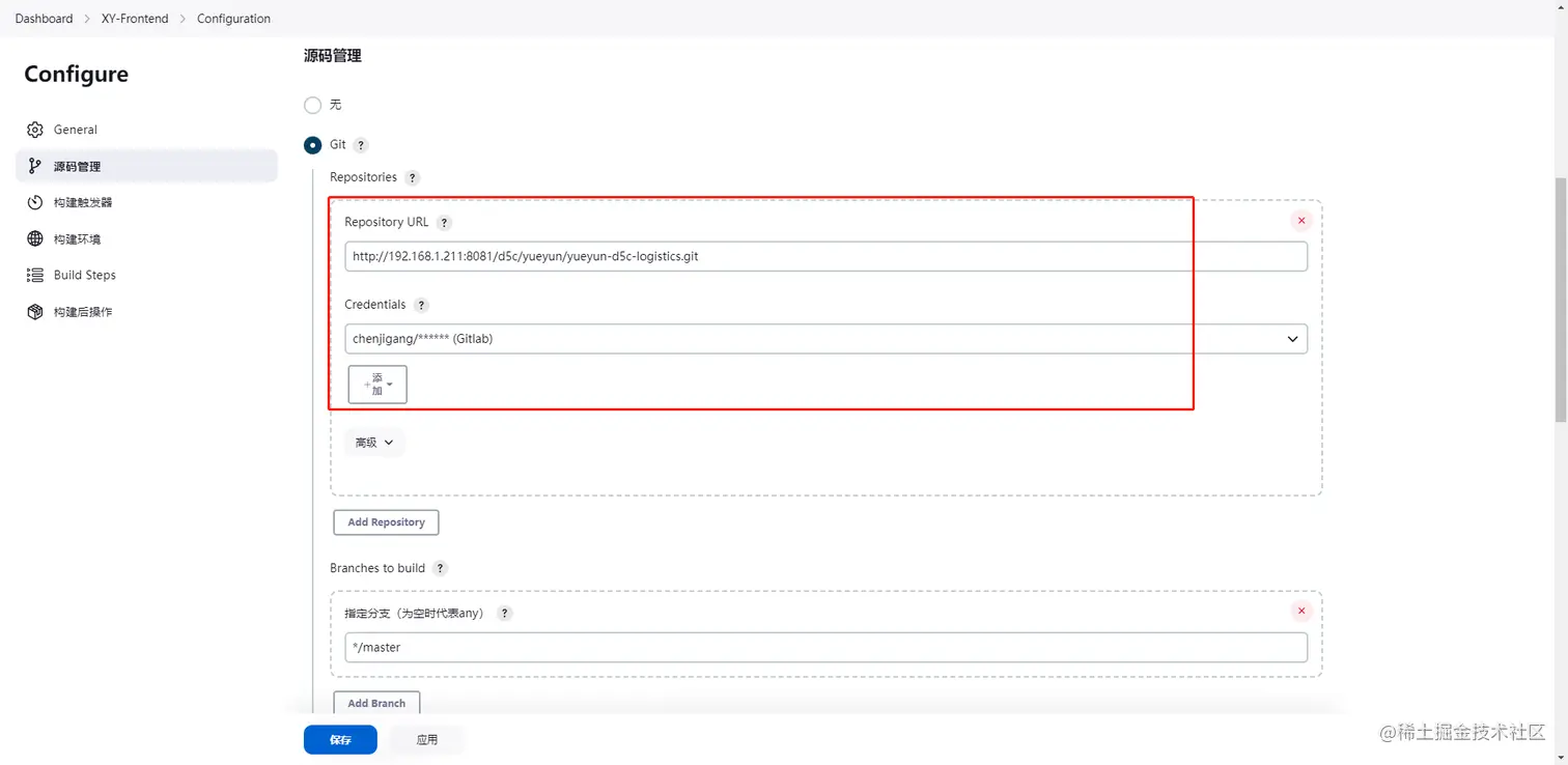 源码管理中选择Git,账号密码选择我们前面配置Git时添加的Gitlab账号。