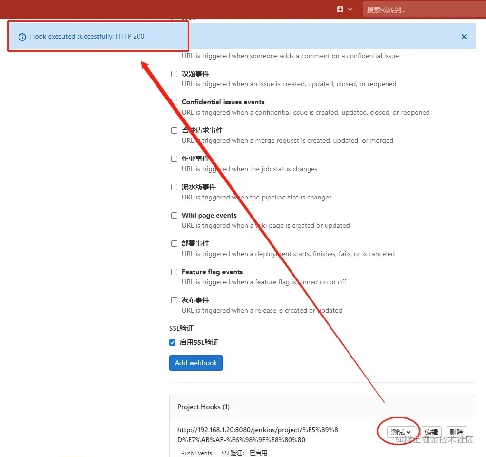 具体操作步骤及常见的报错问题解决可以参考之前的一篇文章《Gitlab配置webhook趟坑全纪录&由此引发的常见环境问题排查思路与思考总结》,大多数配置过程中遇到的问题,按照里面的操作方法都能够得到解决。最后可以测试一下,出现200表示配置的webhook钩子可用。