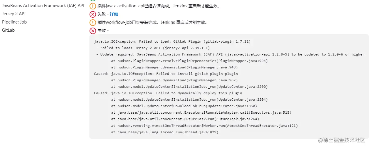 此处我在安装Gitlab插件的时候报错了,提示我必须将“JavaBeans Activation Framwork”插件升级到1.2.0-6版本或以上才能才行(当前是1.2.0-5的版本)