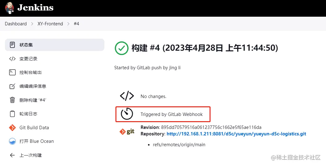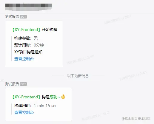 前端提交代码后,就会自动触发webhook钩子,触发jenkins自动执行构建,随后jenkins通过企微通知插件将构建结果通知企业微信群。如果是用户手动触发的构建,会提示是由Jenkins用户触发的构建,而如果是gitlab webhook自动触发的构建,会提示“Triggered by GitLab Webhook”: