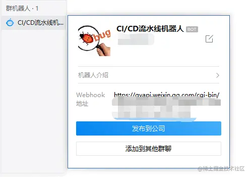 比如可以取名:CI/CD流水线机器人,随后记住Webhook地址,后面会用到
