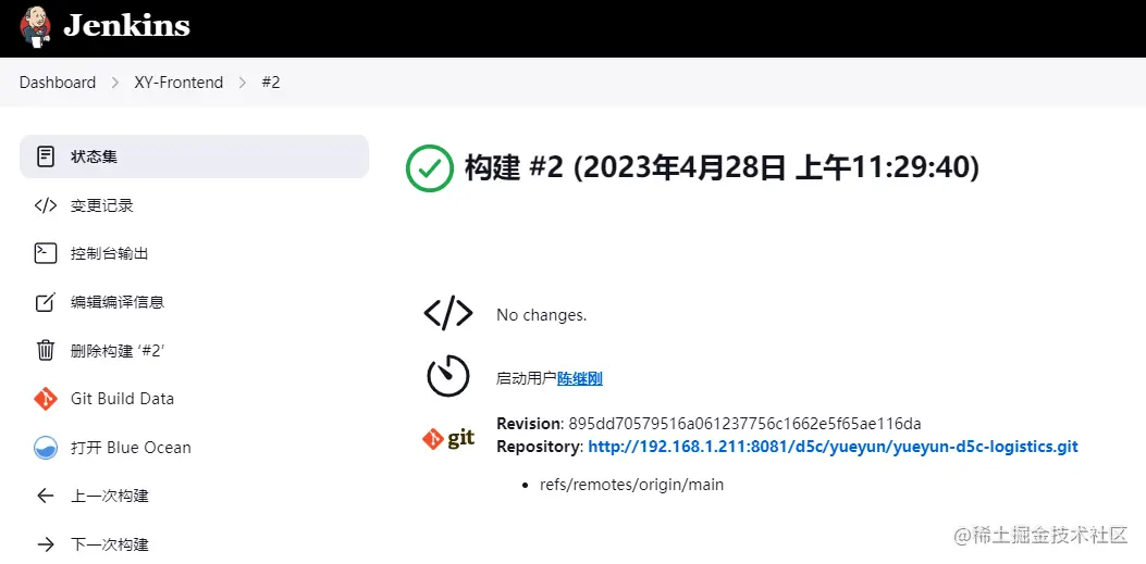 再次构建,构建成功,如果是手动触发的构建,会提示是由Jenkins用户触发的构建: