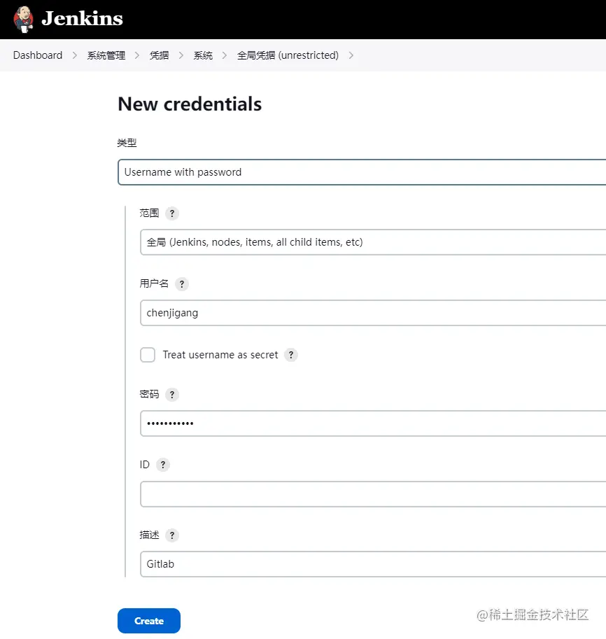 系统管理-凭据-系统-全局凭据-添加凭据,输入gitlab的账号密码,保存。当然这一步我们是提前添加好账号,也可以在配置项目的时候添加。