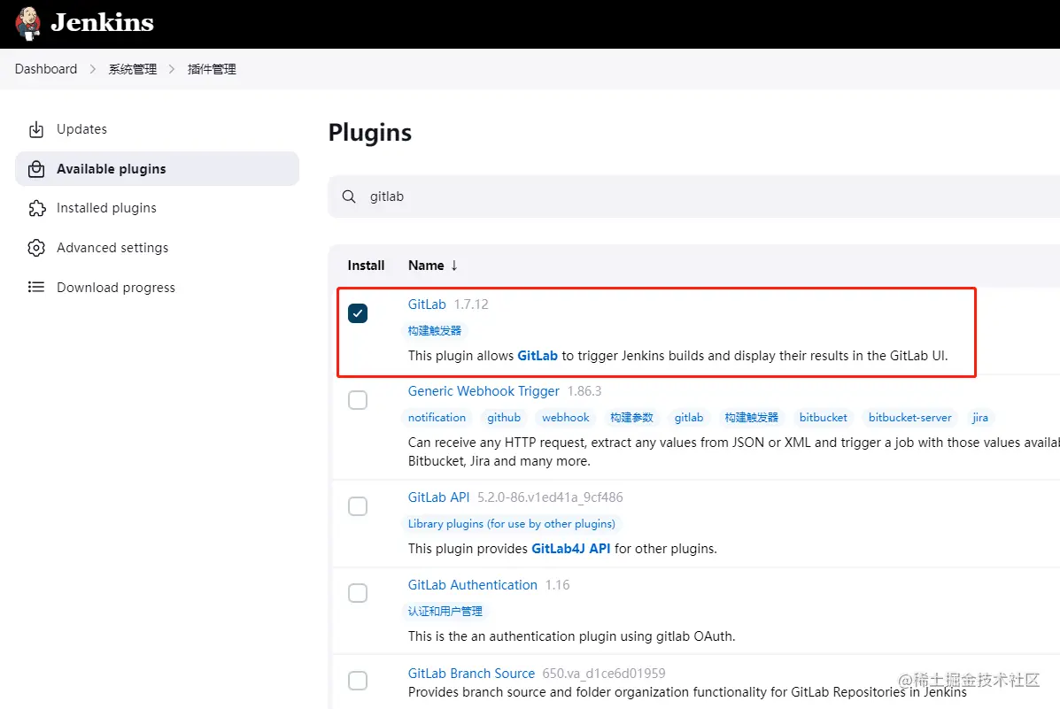 系统管理-插件管理-可用插件,搜索gitlab插件安装。如果安装插件遇到“”报错,可以参考第二篇《CI&CD夺命十三剑2-Jenkins环境搭建&常见使用技巧》---“Jenkins使用技巧及常见问题解决”中的解决办法。