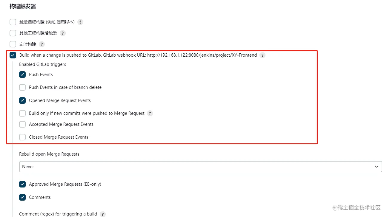 构建触发器中选择“Build when a change is pushed to GitLab. GitLab webhook URL: http://192.168.1.122:8080/jenkins/project/XY-Frontend”选项,注意:前面一定要先安装Gitlab插件才会有这个选项。选择此选项的用意是:当源码管理中配置的gitlab项目一旦提交代码,就会触发本项目自动进行构建,当然,还有一个必不可少的步骤就是要在gitlab项目中配置一个webhook钩子。