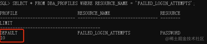SELECT * FROM DBA_PROFILES WHERE RESOURCE_NAME = 'FAILED_LOGIN_ATTEMPTS';