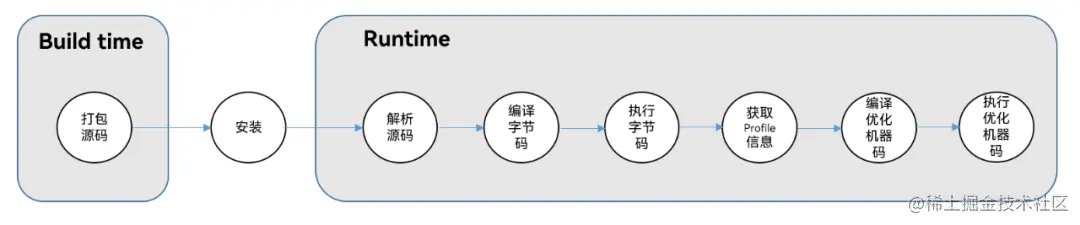 JS开发者直接把源码打到应用包里,当运行时,引擎解析JS源码需要先将JS源码编译成字节码,然后再执行字节码。引擎抓取剖析一些运行时的信息,再使用JIT Compiler在运行时编译生成优化机器码,最后才能执行优化机器码,这样才能以比较高的性能执行JS。