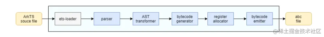 ArkCompiler的编译工具链以ArkTS/TS/JS源码作为输入,将其编译生成为abc(ArkCompiler Bytecode,即方舟字节码)文件。