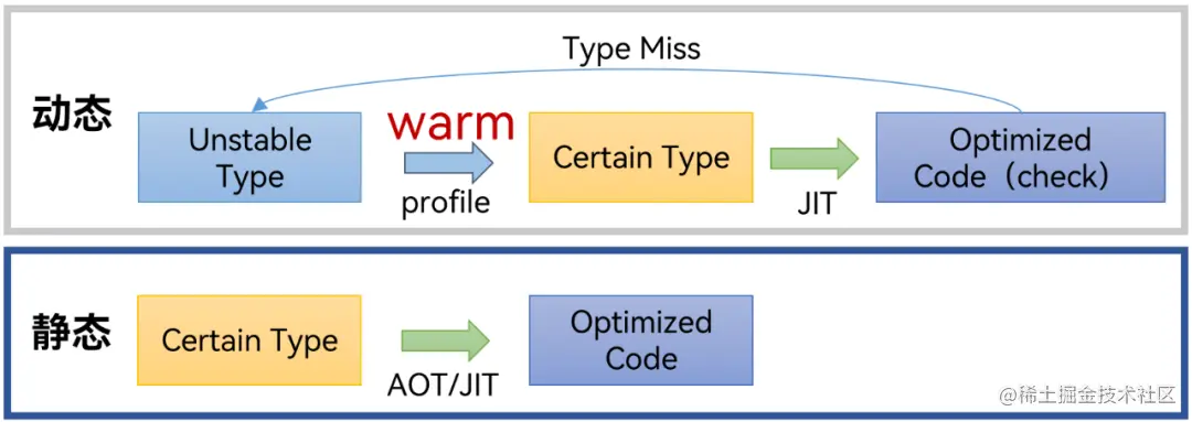 动态类型语言由于运行前无法确定对象类型,需要等程序运行一段时间后,JIT Compiler(Just-In-Time Compiler,即时编译器)才能根据抓取到的运行信息明确对象类型并编译生成对应的优化机器码。