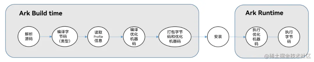 ArkCompiler支持应用运行前就编译出优化机器码和字节码。当应用在移动设备上首次运行时,就可以直接运行高性能优化机器码了。