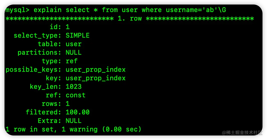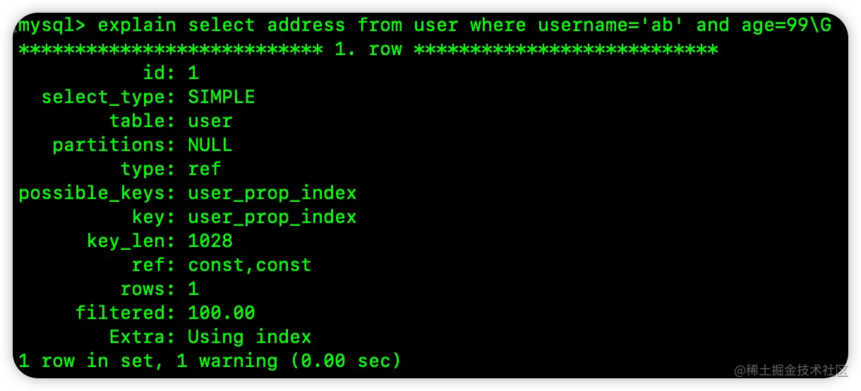 可以看到,这张表中有一个名为 user_prop_index 的索引,这个索引中一共存在三个字段,分别是 username、age 以及 address,现在我们来看如下 SQL 的执行计划: