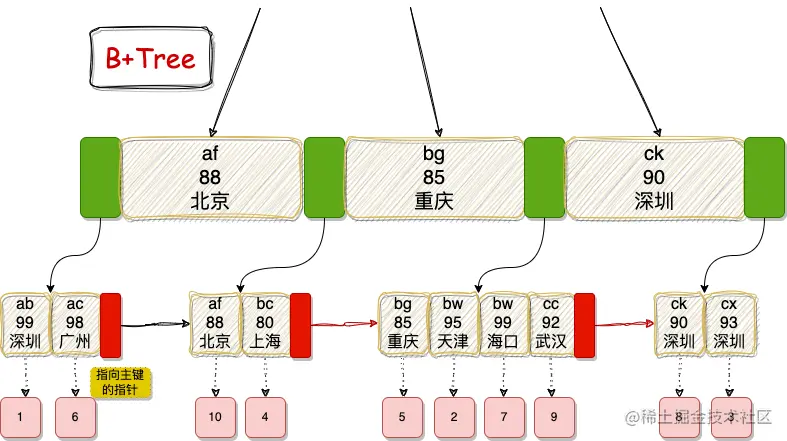 上面这个索引树是一个非聚集索引或者也可以说是一个二级索引,这种索引区别于我们之前文章跟大家聊的聚集索引(再聊 MySQL 聚簇索引),在聚集索引中,叶子结点就是这一行的数据,但是在二级索引中,叶子结点中保存的是主键值。