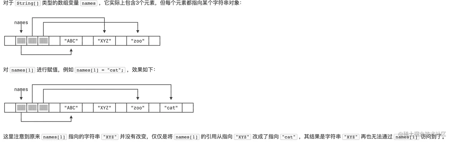 - 那么如果数组中的元素是字符串,同样是引用变量,比如我们定义以下嵌套引用变量,如果对其进行索引赋值,那么指向是怎么变化呢?