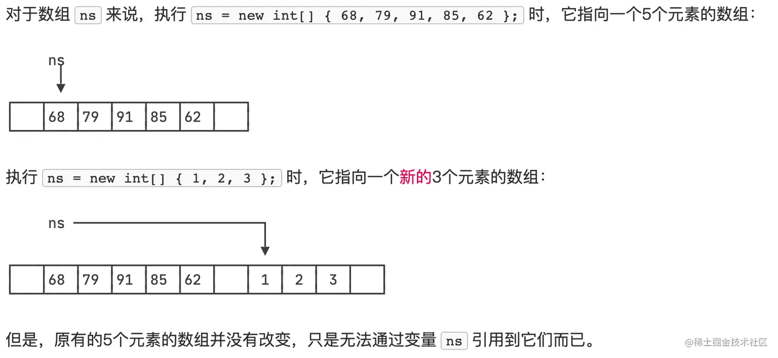 - 同样的问题ns的长度变化了,但是前面说到数组的长度一旦定义了就无法改变,这不是矛盾了吗?其实这个与前面字符串赋值远离类似,只是改变了"指向"