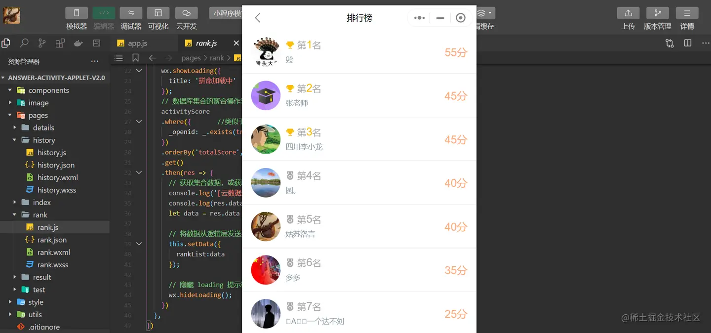 排行榜页面实现答题成绩排名