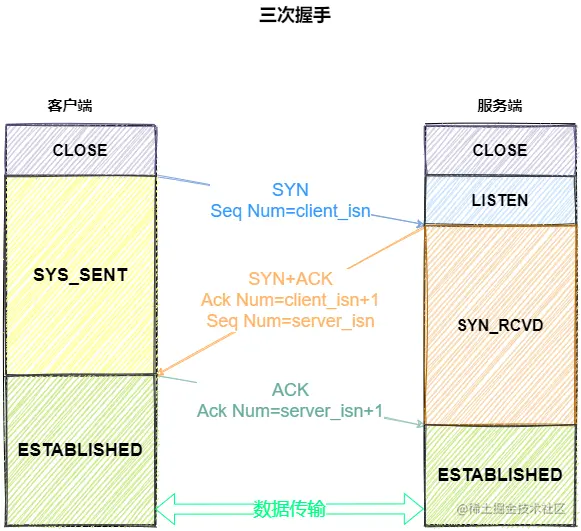 client_isn),将此序号置于 TCP 首部的「序号」字段中,同时把SYN标志位置为1,表示SYN报文。接着把第一个 SYN 报文发送给服务端,表示向服务端发起连接,该报文不包含应用层数据,之后客户端处于SYN-SENT状态。