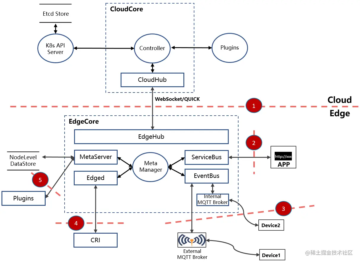 如数据流图所示,当数据流穿越不同的信任级别(区域)时,就存在信任边界,已在图中用红框标出。下面将详细分析KubeEdge系统架构中的信任边界(引用自KubeEdge第三方安全报告)、社区已有的消减措施并给出安全加固建议。