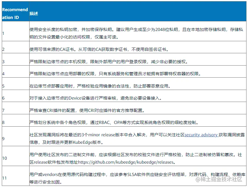 • KubeEdge用户手册中已提供各个组件的详细功能描述及配置使用指导文档 ,指导系统管理员或操作人员正确操作,减少人为误操作或误配置导致的安全风险。由于KubeEdge的持续迭代,该文档也将持续更新并完善。