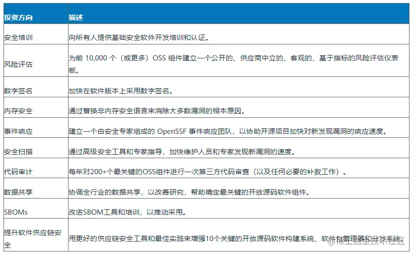 在2022年5月第二届开源软件安全峰会上,Linux基金会、OpenSSF及各行业安全专家,就提高开源软件安全性计划达成共识,将集中在以下10个方向进行投资和安全改善,项目投资1.5亿美元,分为两年规划。