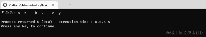 printf("名单为:a--%c\tb--%c\tc--%c\n",i,j,k);