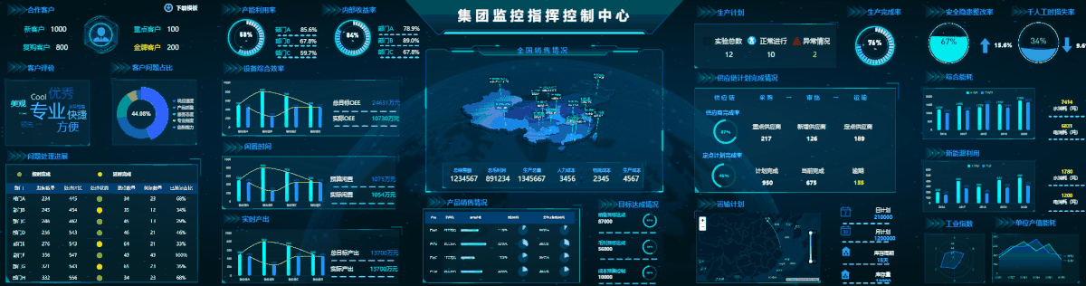 帆软为企业提供数字大屏解决方案,无须专门定制开发,就能轻松制作出酷炫的管理驾驶舱,支持发布到多场景的数据大屏上进行可视化集中管控。