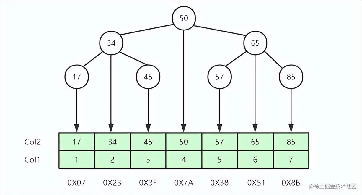 二叉树的特点:左边子节点的数据小于父节点数据,右边子节点的数据大于父节点数据。如下图所示,如果 col2 是索引,查找索引为 65 的行元素,只需要查找两次,就可以获取到行元素所在的磁盘指针地址。
